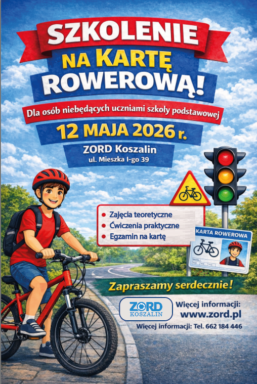 Z uwagi na niewystarczającą ilość zgłoszeń szkolenie w zakresie karty rowerowej dla osób niebędących uczniami szkoły podstawowejzostaje przesunięte na dzień: 12.05.2026 r.